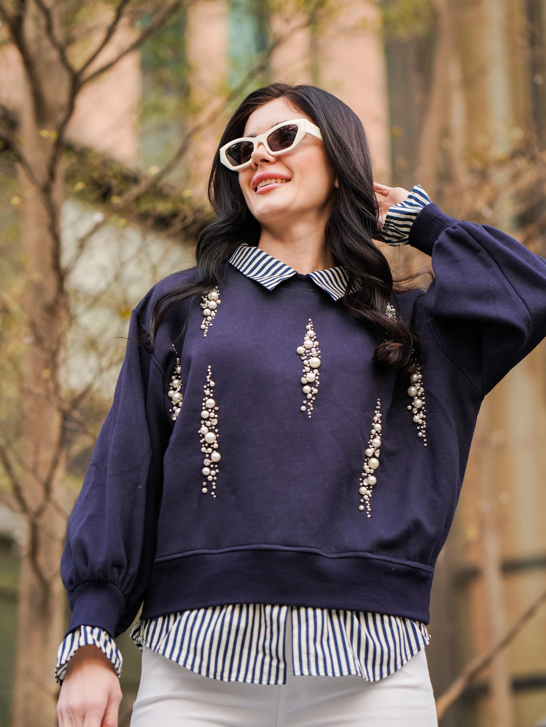 • Fake curved false stripped fabric shirt hem and collar sweatshirt.• Ribbed sweatshirt sleeves with...