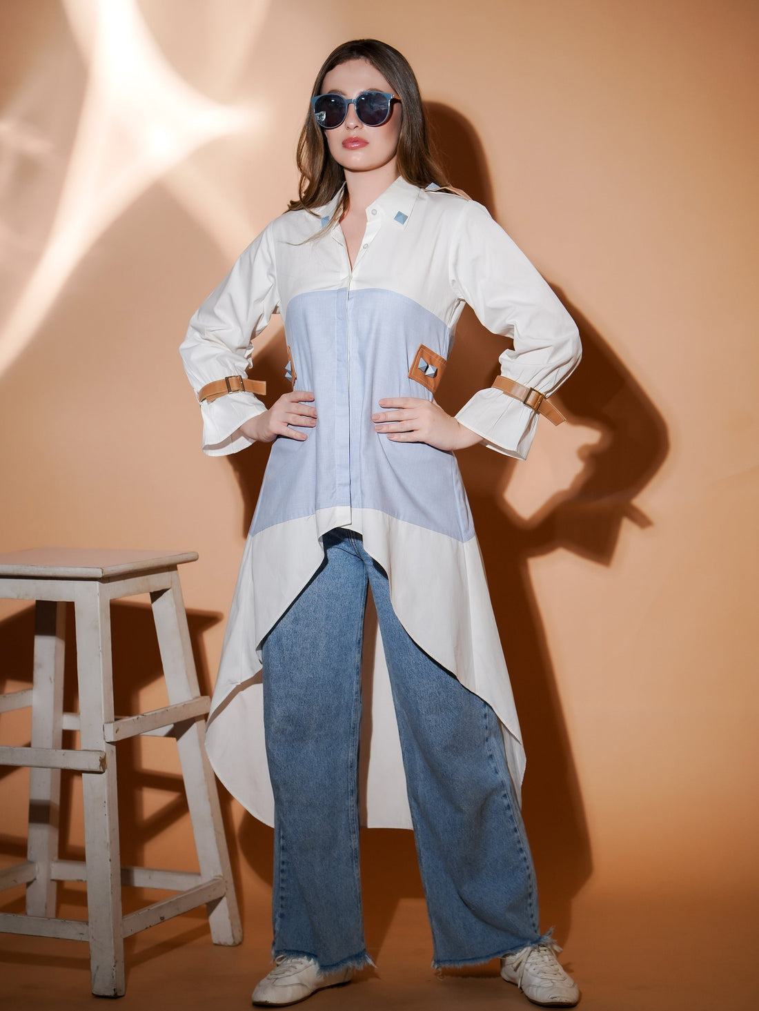 • High/low cut shirt with collared neck.• Tapering front.• Long taping back•...