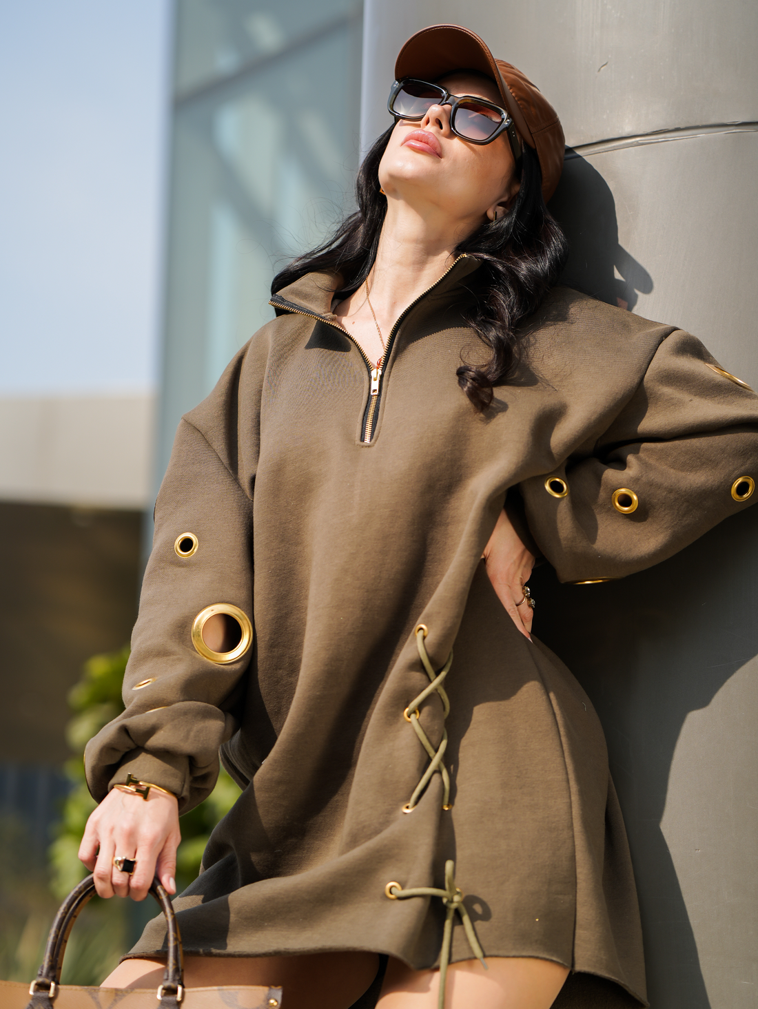 • Loose fit /Oversized sweatshirt dress with dropped shoulder sleeves.• Eyelet detailed sleeves.• Highrise zip...