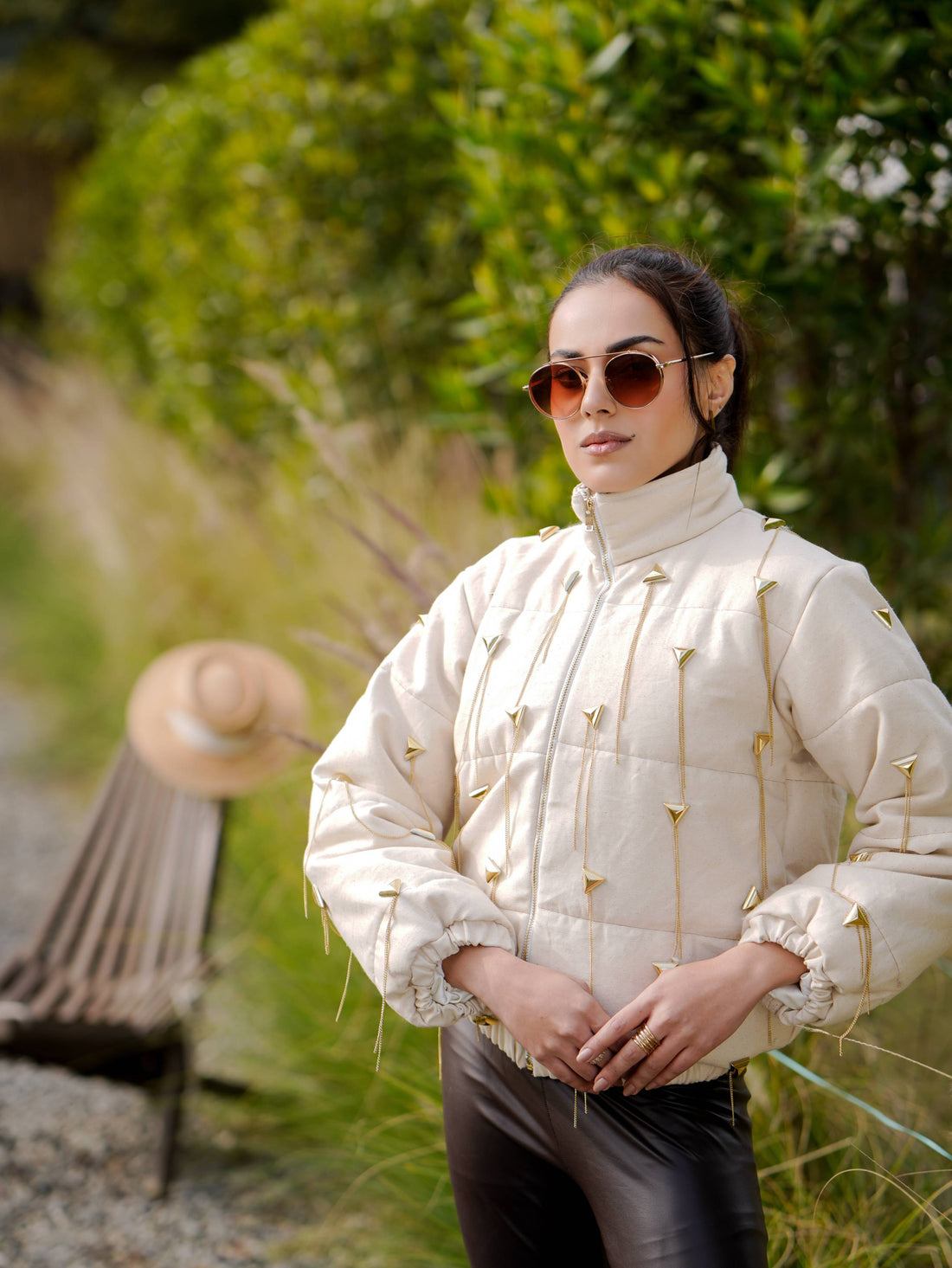 • Cropped puffer jacket.• Embroidery detailing on front .• Front zip open.• High collared neck....
