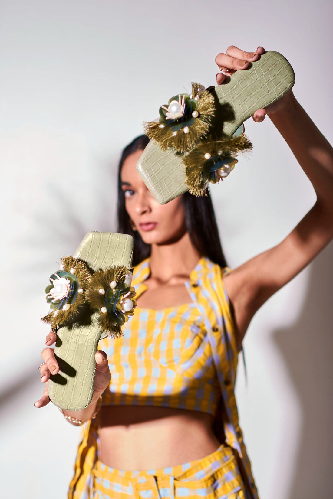 Vegan , embellished and printed! Handcrafted with sequin flowers and stones on a printed base....