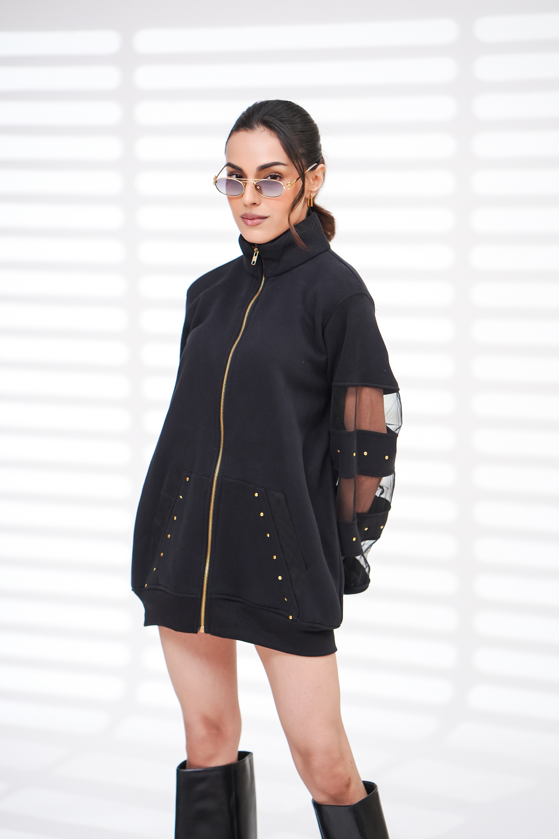 Sweatshirt dress with front zip fastening . Relaxed fit. Net detailing on the sleeves. Fabric:...