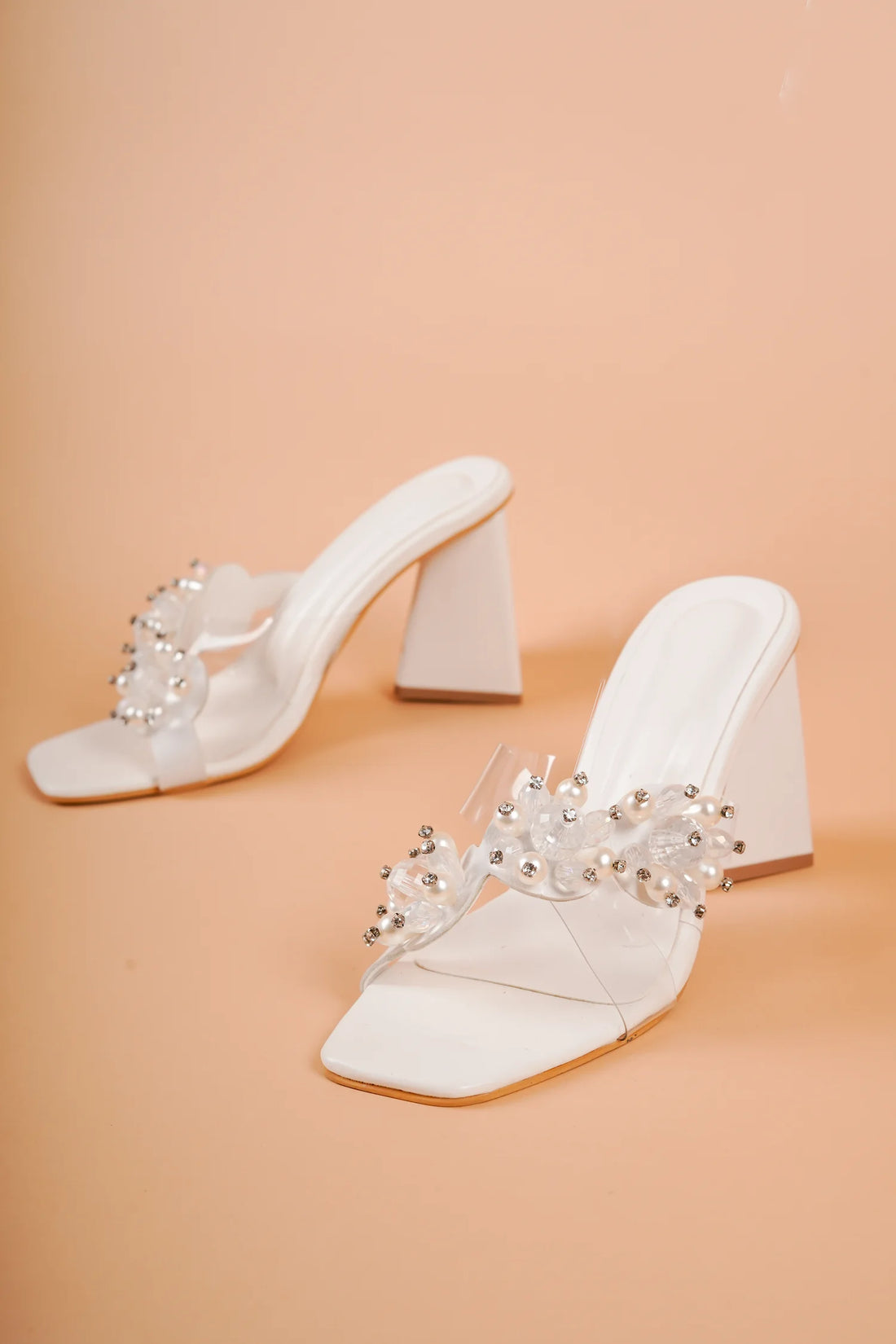 Strappy cut out band with extra support/hold. Embellished in pearl and glass tassels. Your feet...