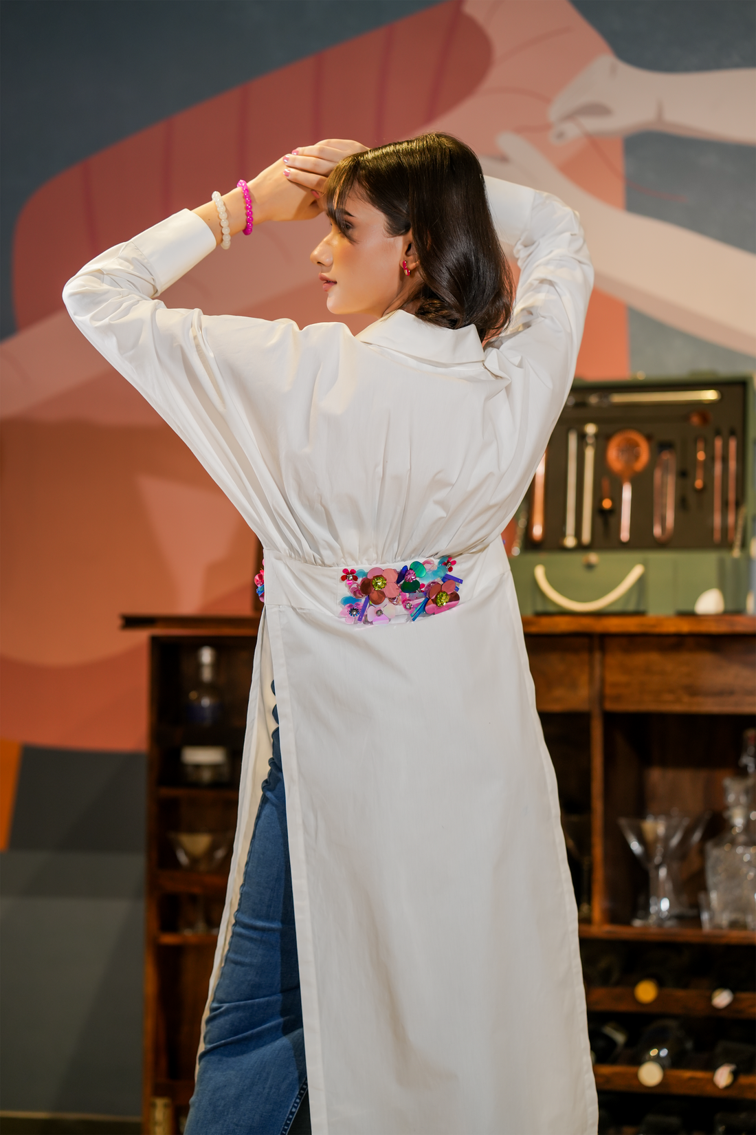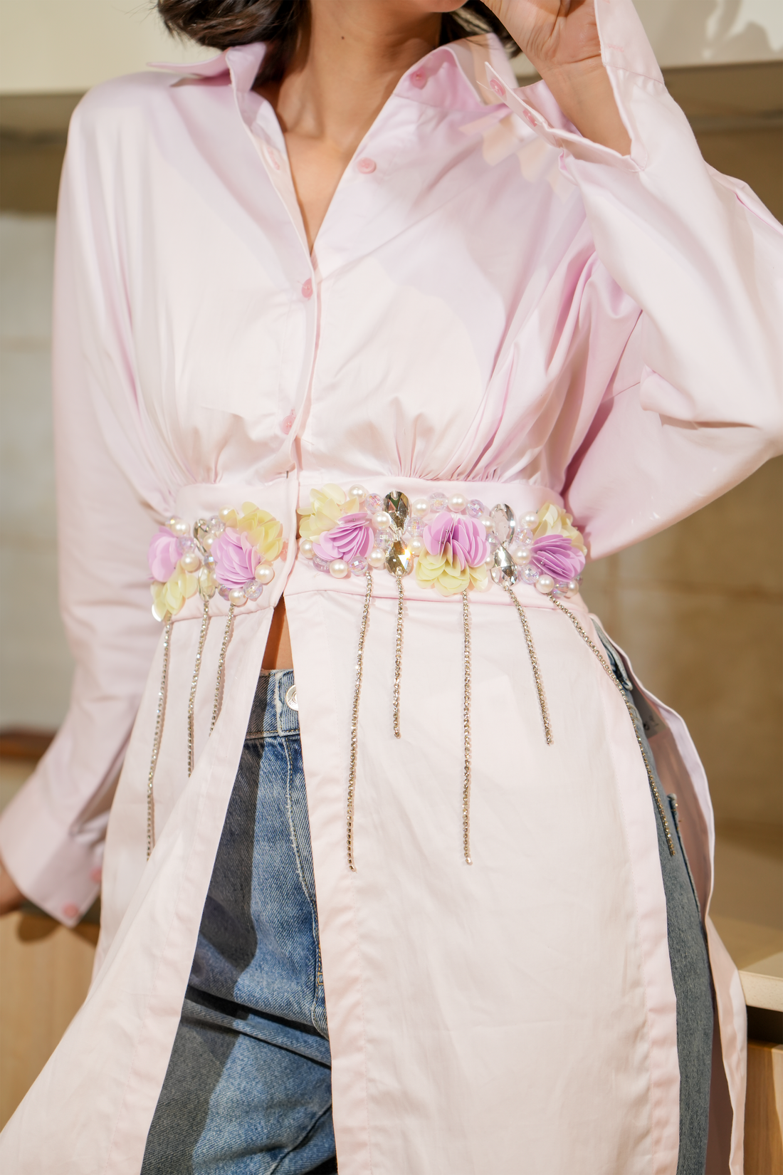 This cape shirt features a waisted silhouette with dropped oversized sleeves. Densely embellished around the...