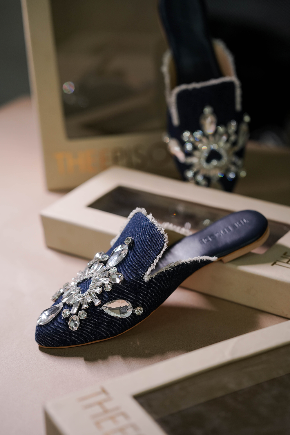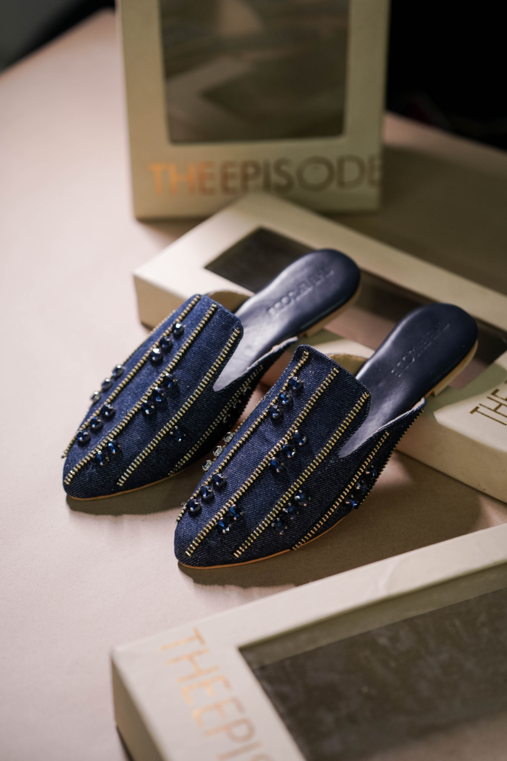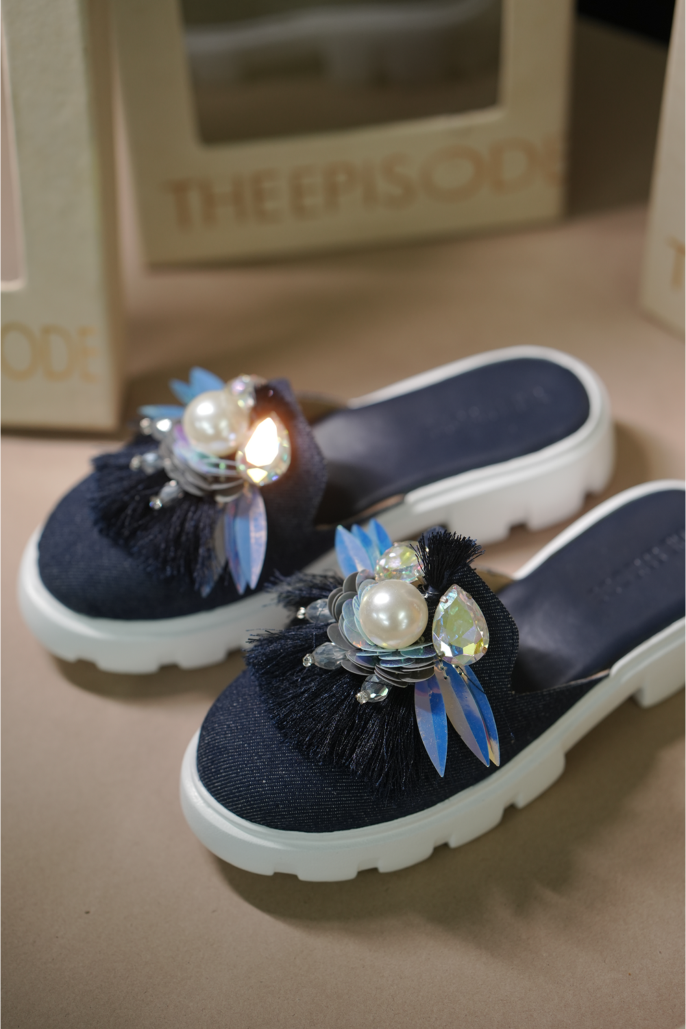 Denim Mules with super cushioning below and inside, with the right elevation. 3D embellished, keeping...