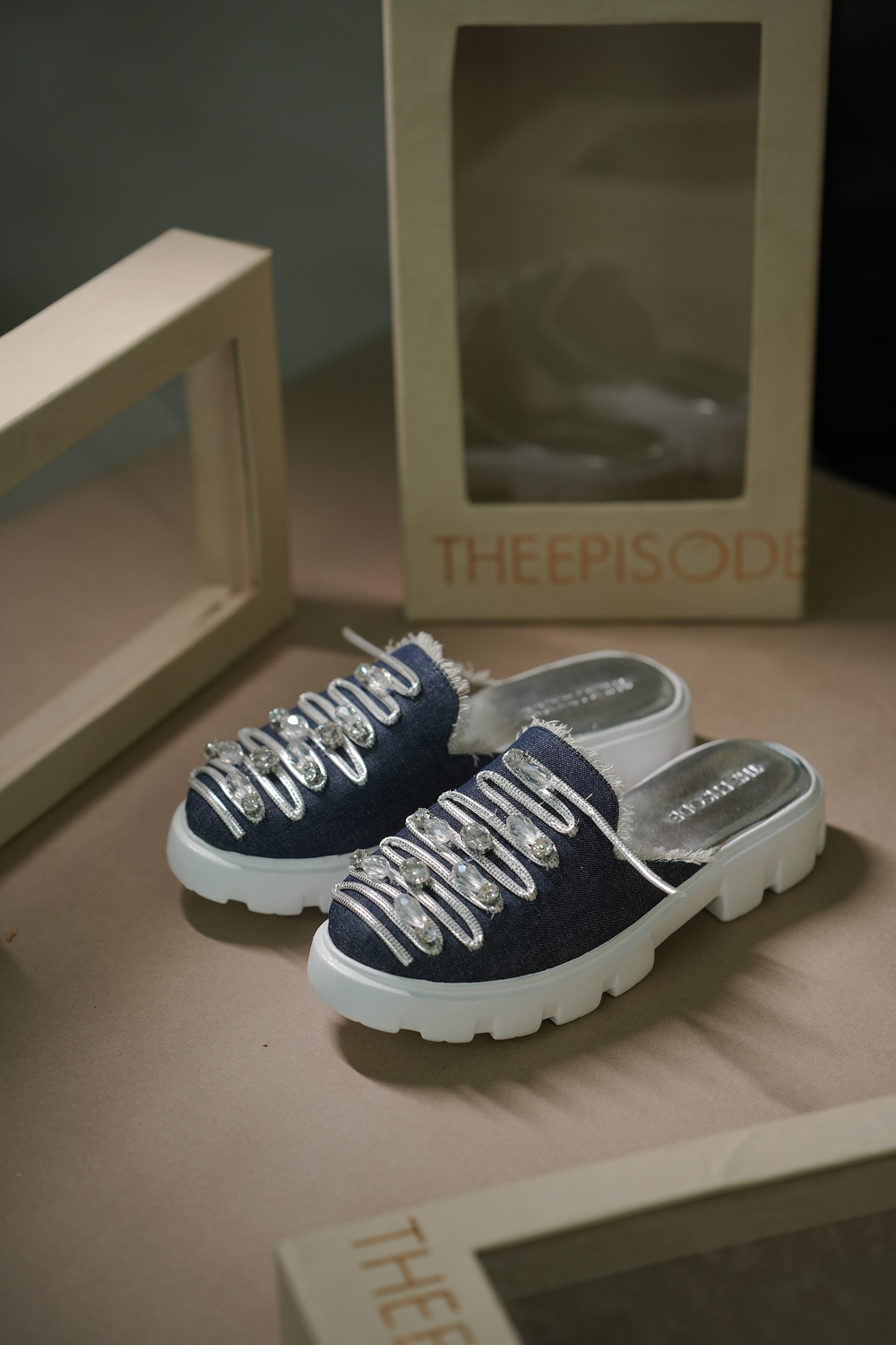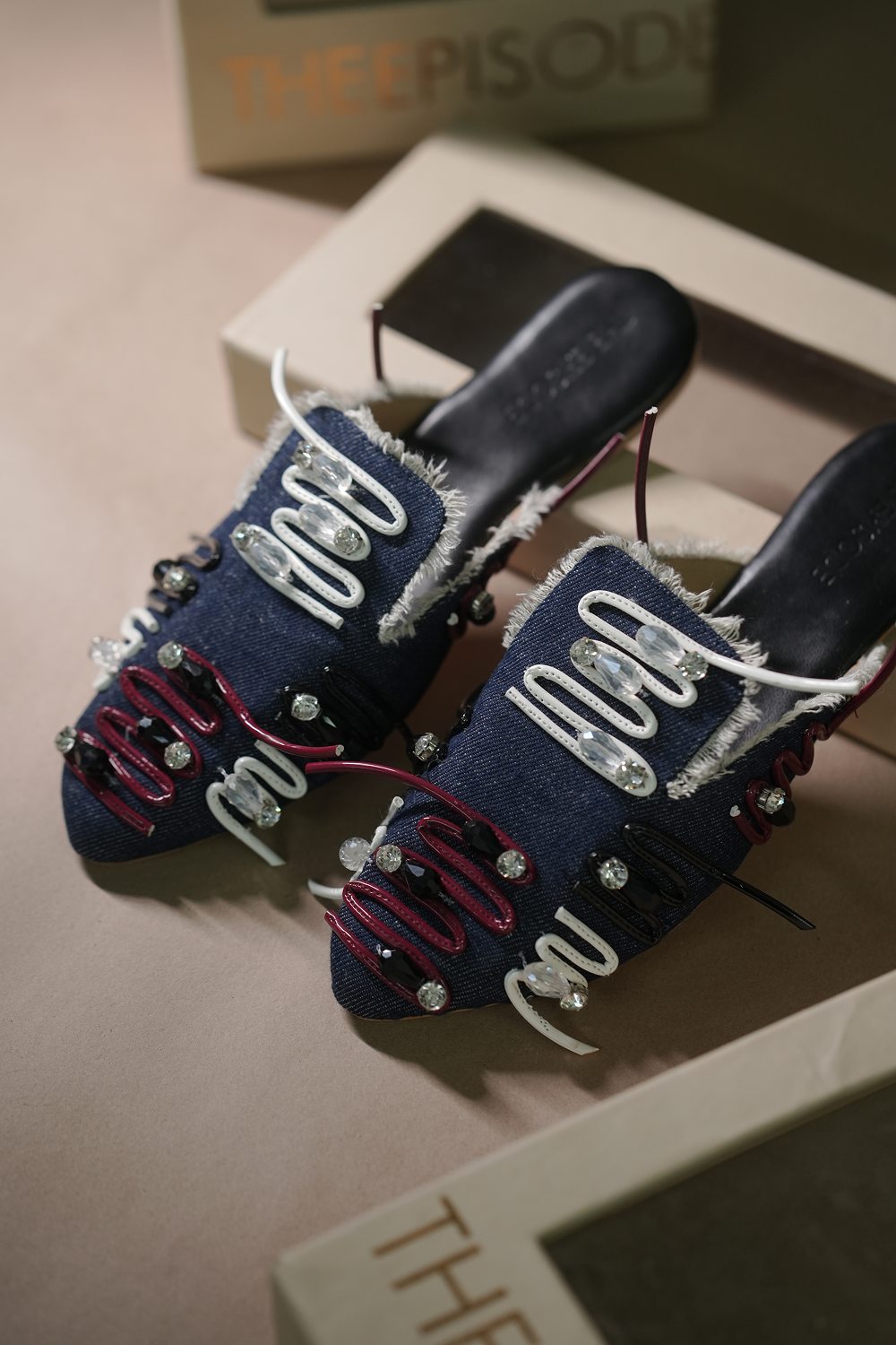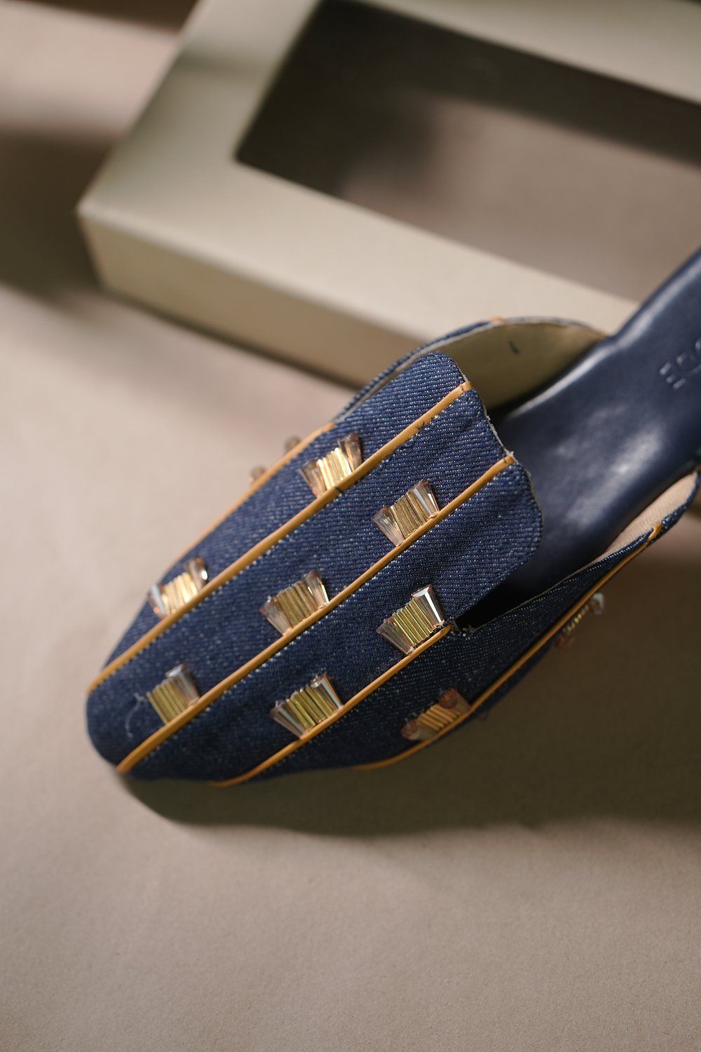 Denim Mules with super cushioning below and inside, with the right elevation. 3D embellished, keeping...