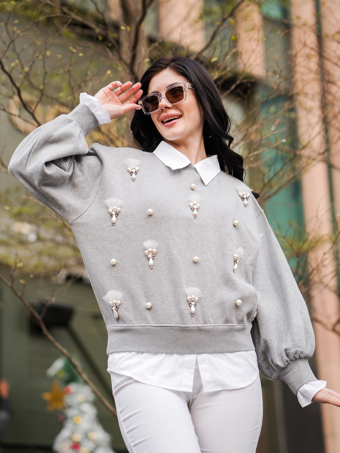 • Oversized Box fit cropped sweatshirt with ribbed thumb-hole cuff.• Pearl embellished.• Ribbed sleeves attached...