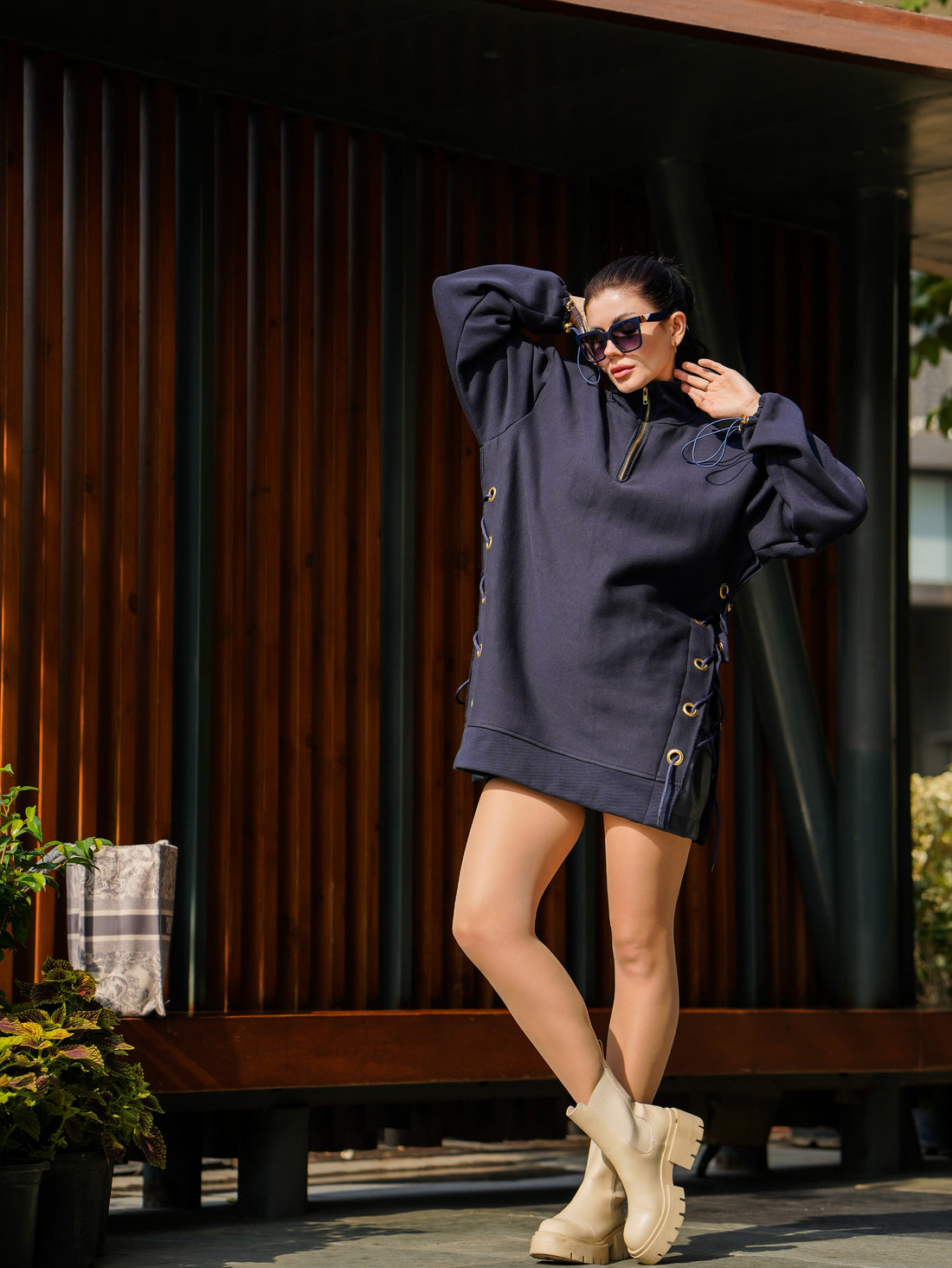 • Loose fit /Oversized sweatshirt dress with dropped shoulder sleeves.• Eyelet detailed sleeves.• Highrise zip...