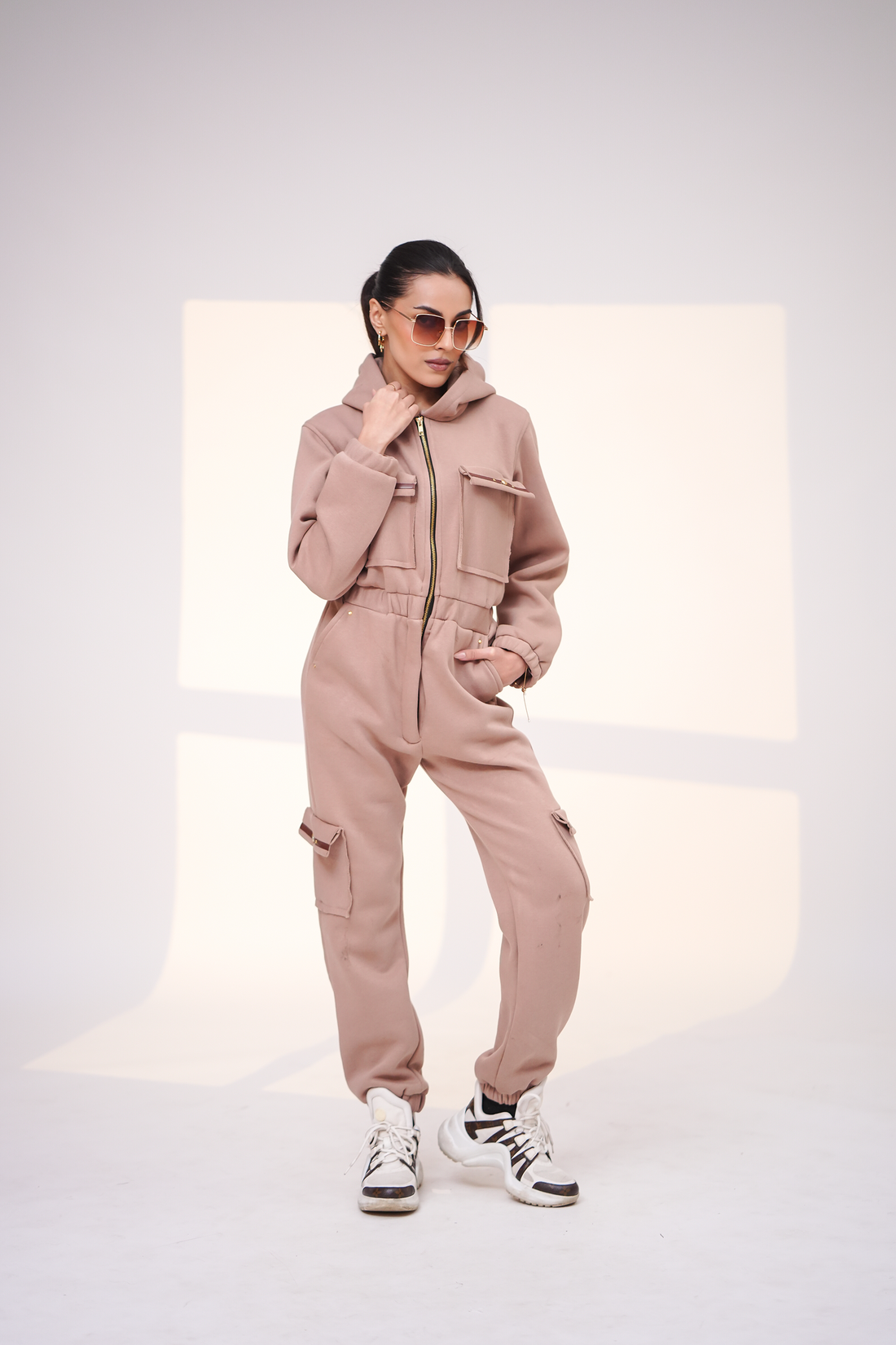 One piece dress Double zippered front Front detailing Fabric: Fleece: 100% Cotton fleece Color: Cream...