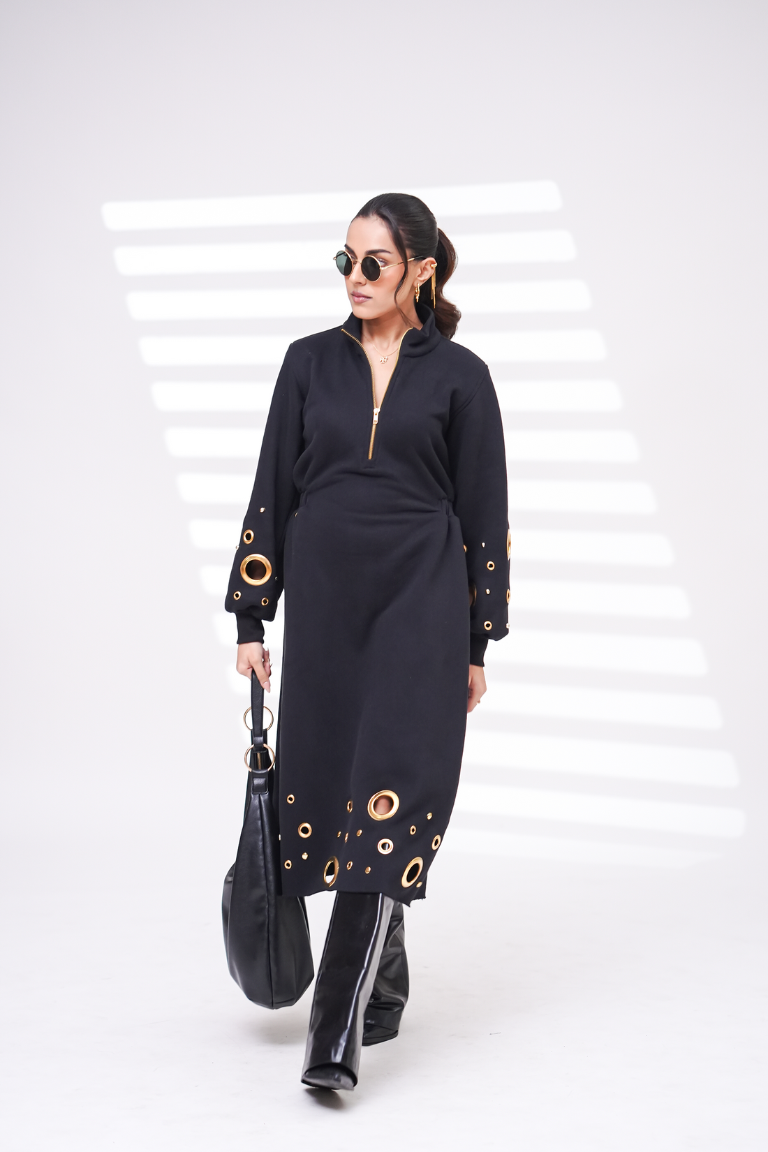 • Loose fit /Oversized sweatshirt dress with dropped shoulder sleeves.• Eyelet detailed sleeves.• Highrise zip...