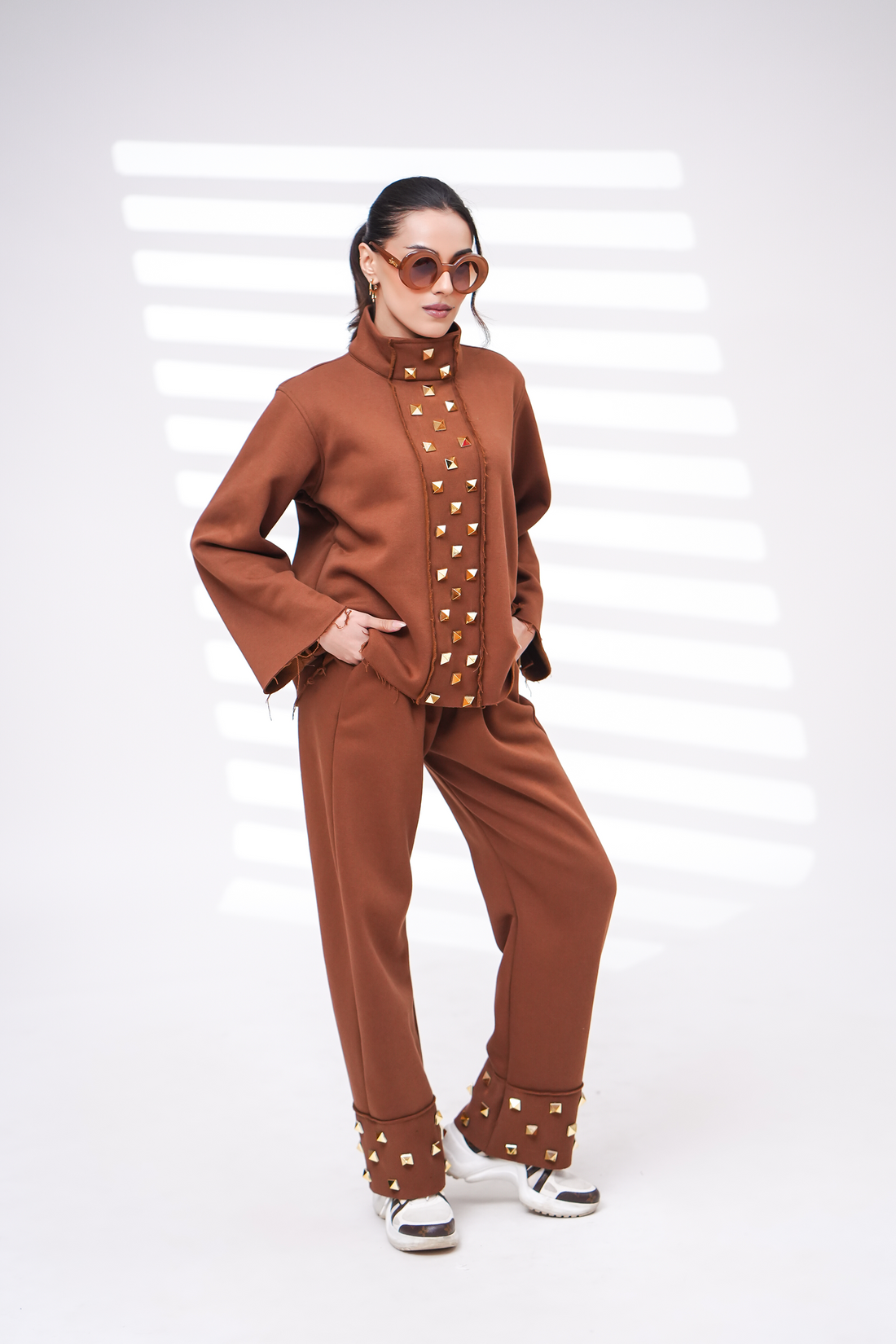 Leisure two-piece set. Embellished Sweatshirt with back zip closure Pant in elasticated high-waist, solid colour,...