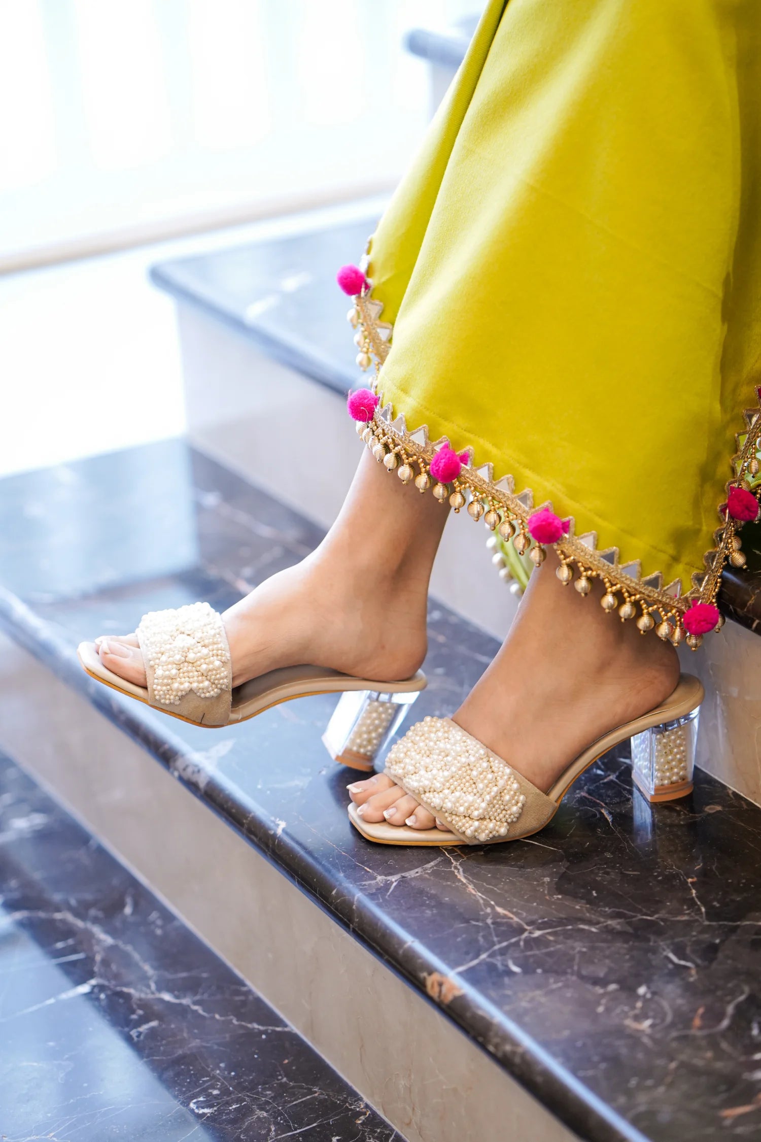 Beautifully handcrafted with intricate pearls in a 3D placement. Regal, elegant and so graceful! And, the pearl filled heels are ofcourse a sure head-turner!