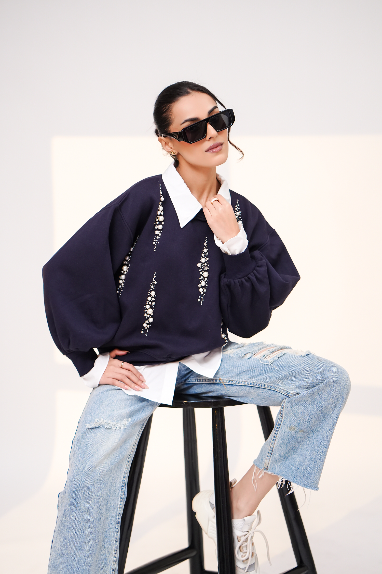 • Ribbed sweatshirt sleeves with false stripped fabric cuff.