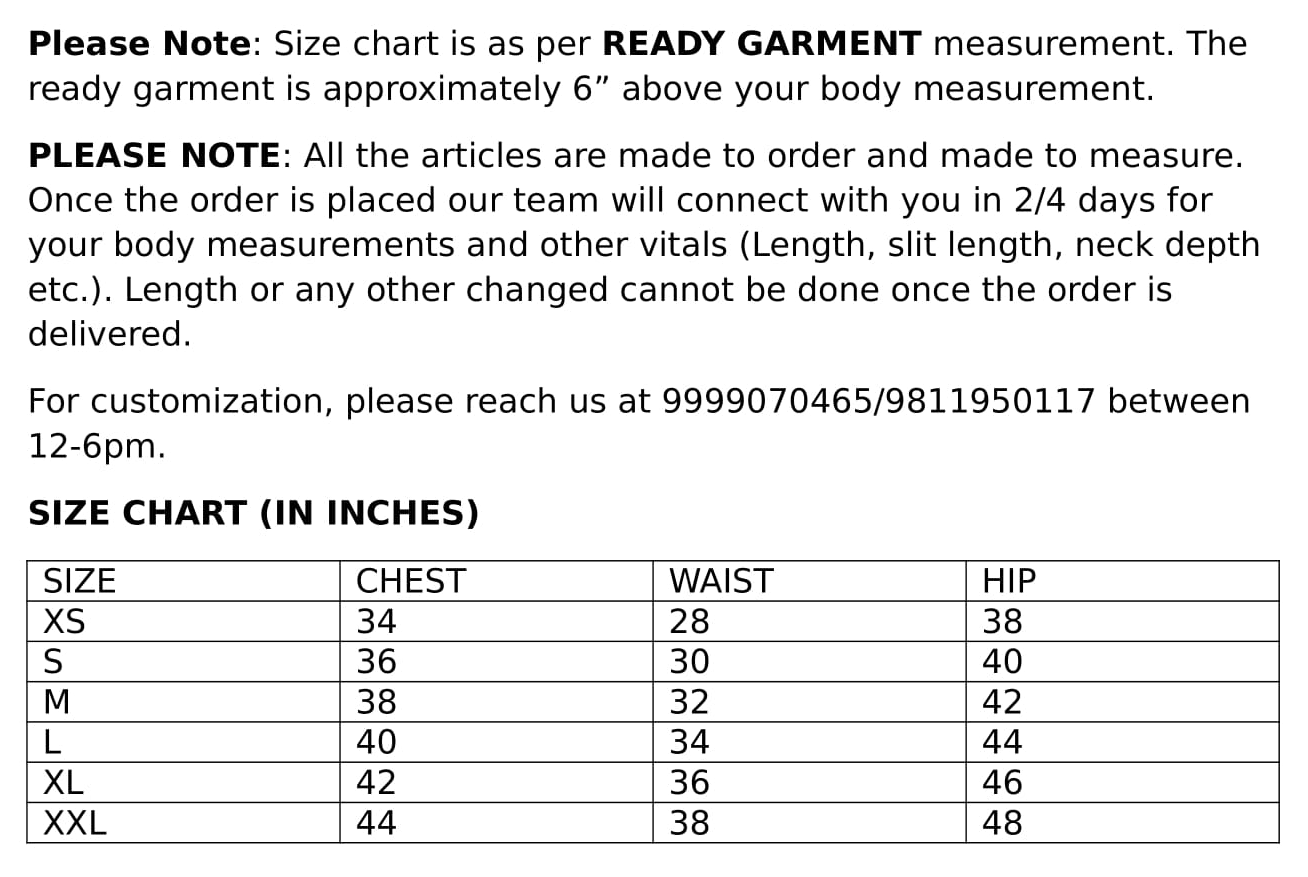 PLEASE NOTE: All the articles are made to order and made to measure. Once the order is placed our team will connect with you in 2/4 days for your body measurements and other vitals (Length, slit length, neck depth etc.)